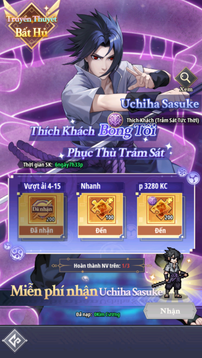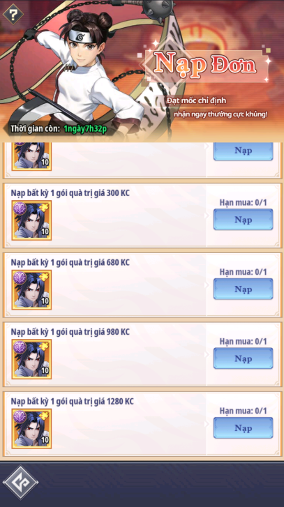 - B1: Mua các gói theo quy định ở các mốc của sự kiện Nạp Đơn để nhận ngay Truyền Thuyết Bất Hủ - Sasuke (ảnh 1)