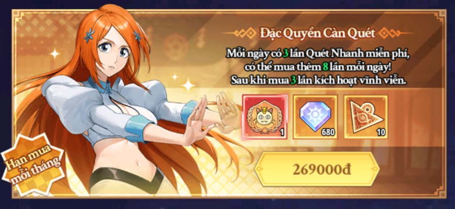 - Sau khi mua Đặc Quyền, mỗi ngày người chơi được nhận thêm 3 lượt Càn Quét miễn phí và có thể mua thêm 8 lượt Càn Quét